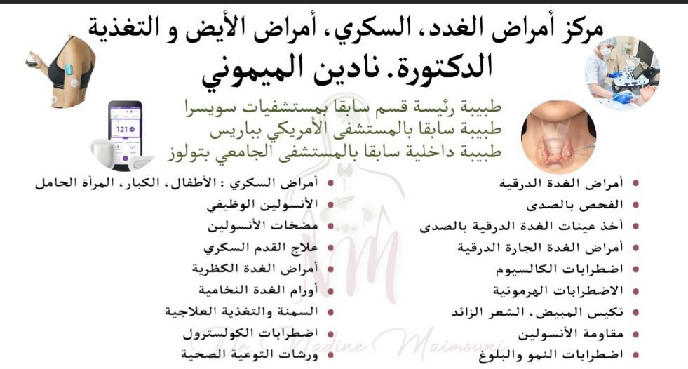 الدكتورة نادين الميموني، مشهود لها بكفاءتها المهنية ومعاملتها الطيبة مع المرضى،حيث تحرص على مرافقة كل مريض بشكل شخصي ودقيق في مختلف مراحل التشخيص والعلاج والمتابعة، وذلك في إطار من الثقة، والتواصل الواضح، والرعاية الشاملة.