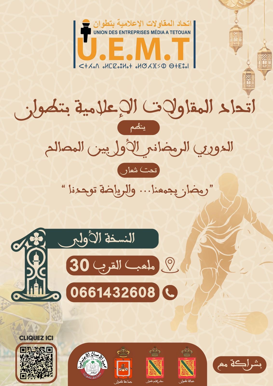 في إطار أنشطته الرامية إلى تعزيز أواصر التعاون والتواصل بين مختلف المصالح والمؤسسات، يعلن اتحاد المقاولات الإعلامية بتطوان (U.E.M.T) عن تنظيم الدوري الرمضاني الأول بين المصالح، وذلك تحت شعار: